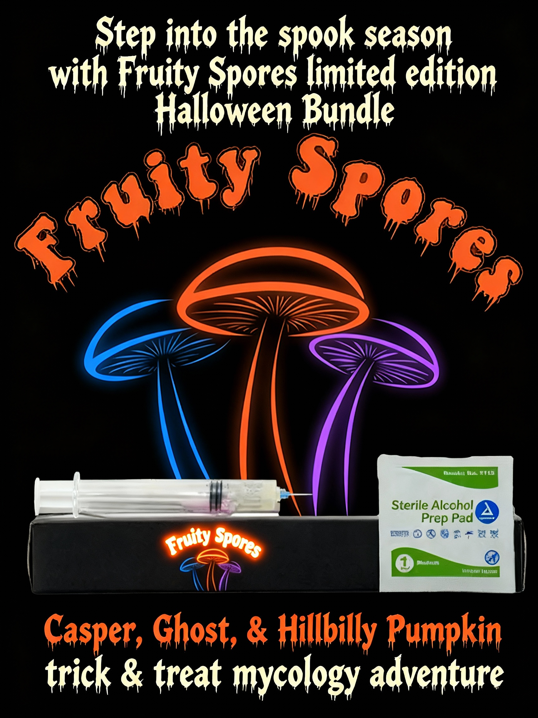 Step into the spook season with Fruity Spores limited edition Halloween Bundle. Featuring three fan favorites- that bring both trick & treat to your mycology adventure!